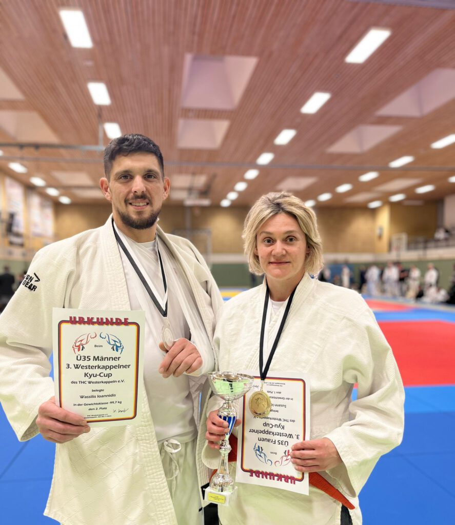 Für den JC Hennef / Eitorfer JC gingen Susann und Wassilis Ioannidis in der Altersklasse Ü35 an den Start. Gecoacht wurden sie dabei von ihrer Tochter Fuli – eine Rollenvertauschung, denn normalerweise steht Fuli selbst auf der Matte, während ihre Eltern am Mattenrand mitfiebern. Das Debüt der beiden verlief äußerst erfolgreich: Wassilis gewann drei Kämpfe und musste sich erst im Finale geschlagen geben, was ihm die Silbermedaille einbrachte. Susann entschied beide ihrer Kämpfe für sich und holte Gold in ihrer Gruppe. Eine beeindruckende Leistung der beiden – und ein Moment, auf den nicht nur Tochter Fuli stolz sein kann.